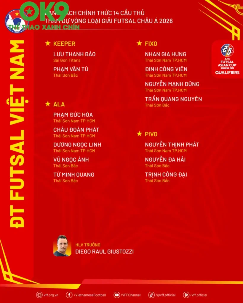 OK9 sẽ luôn đồng hành và cập nhật những thông tin mới nhất về ĐT futsal Việt Nam trong hành trình chinh phục Vòng loại futsal Châu Á. Anh em hãy cùng theo dõi và cổ vũ hết mình cho đội tuyển nhé! Biết đâu, với sự ủng hộ của tất cả chúng ta, các “chiến binh” áo đỏ sẽ tạo nên những bất ngờ lớn, mang vinh quang về cho Tổ quốc!